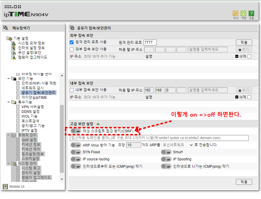 "보안 기능 " => "공유기 접속/보안관리" 에 들어가면 (CSRF) 접근 방지를 off <=> on 할수가 있게되어있다.