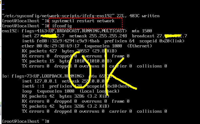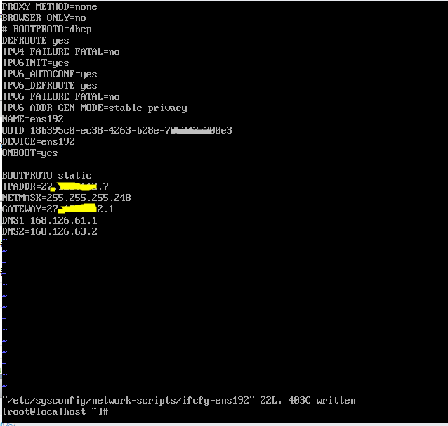 IPADDR=,GATEWAY= , NETMASK= 자신이 부여받은 대역 iP, G/W, NetMASK를 넣는다.