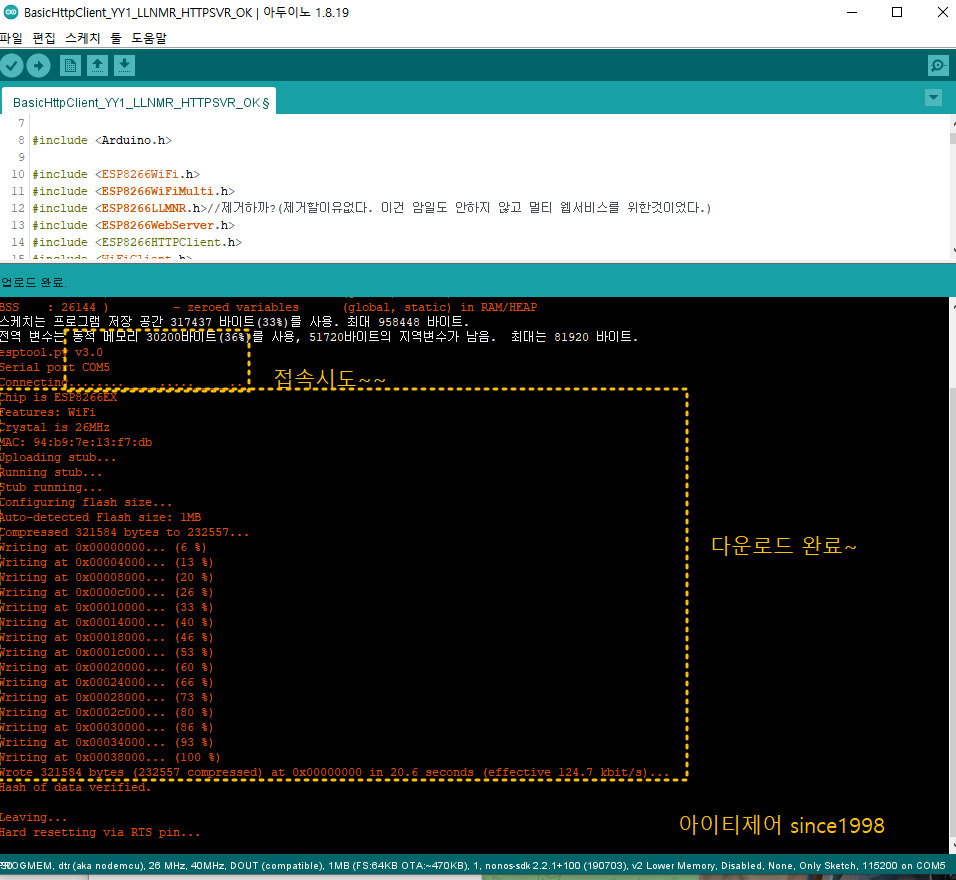 필요지식3/3 : 아두이노IDE 이용하여 ES8266 에 아래에 제공된 프로그램 붙여넣고 다운로드 하는방법.