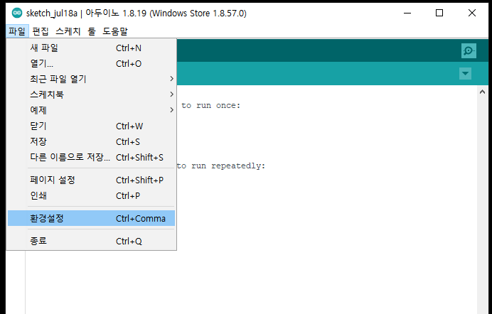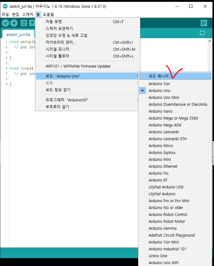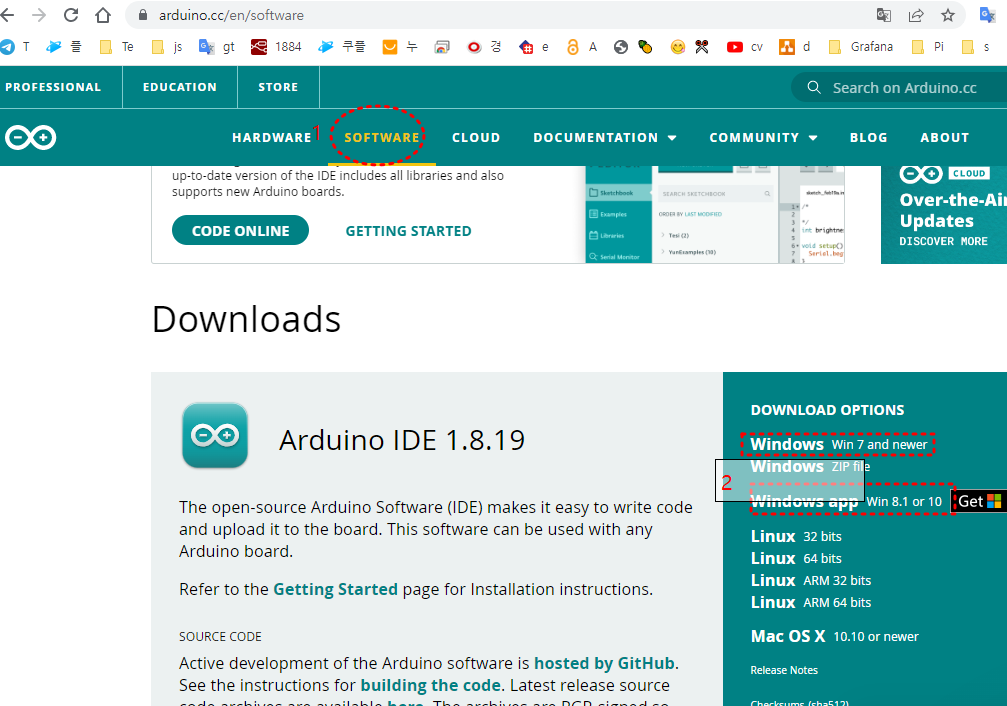 https://www.arduino.cc/ 를 열어 아두이노IDE를 다운받아 설치하고