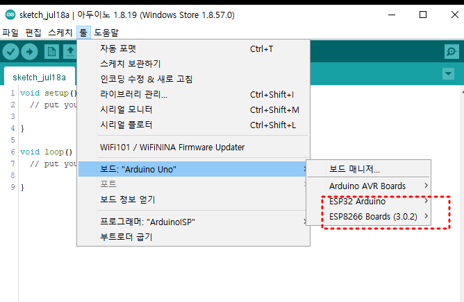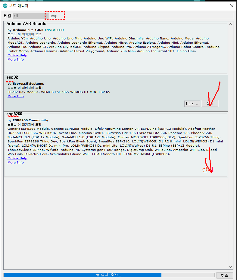 esp 검색하고 esp32 하고 esp8266 설치한다.