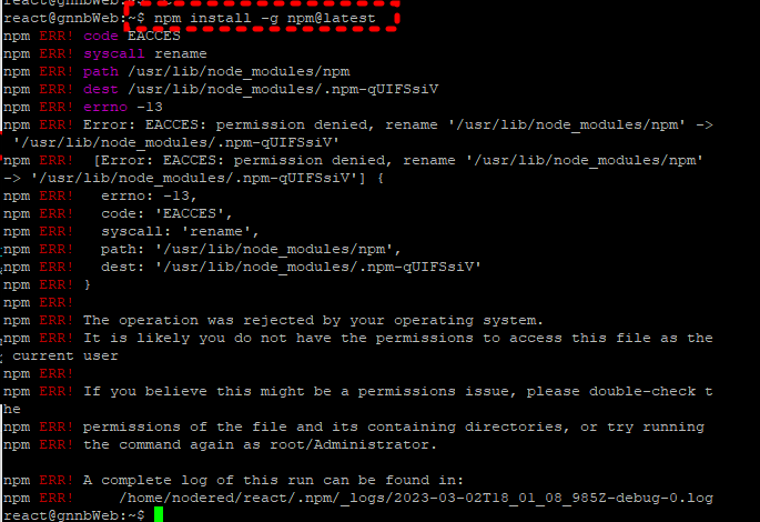 npm ERR! /home/nodered/react/.npm/_logs/2023-03-02T17_55_50_540Z-debug-0.log