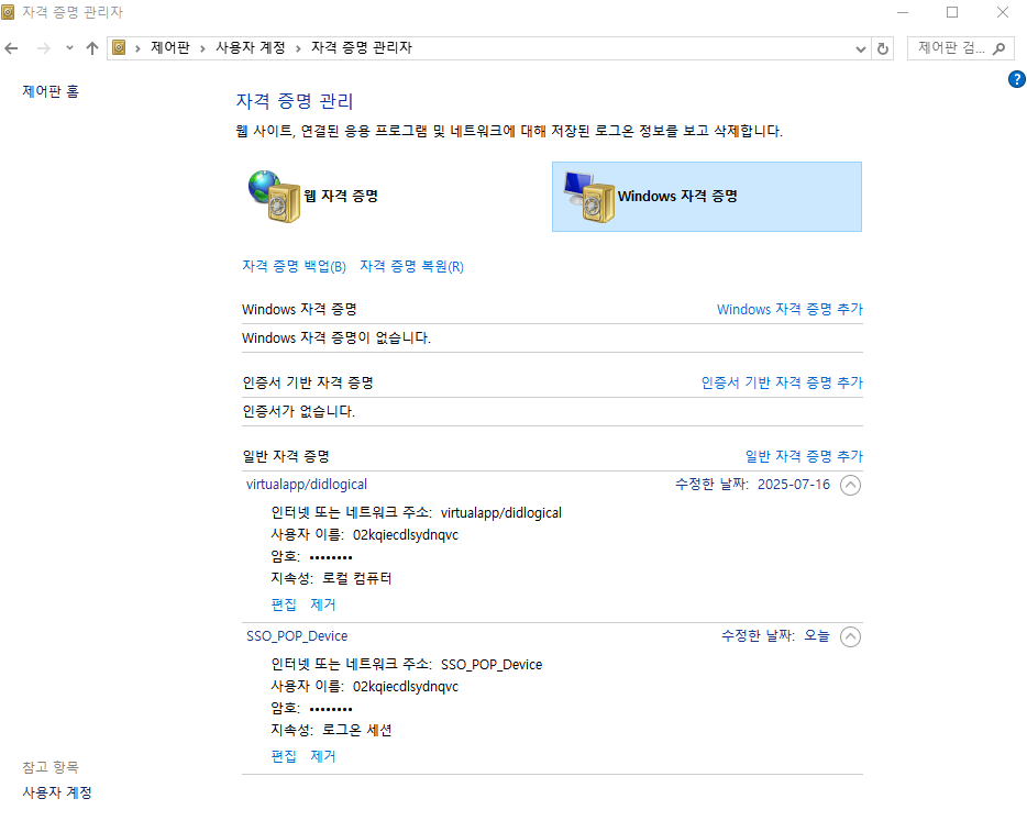 - 시작 → 제어판 → 사용자 계정 → 자격 증명 관리자