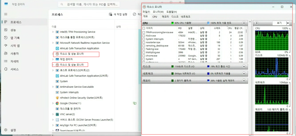 - 혹은 작업관리자 > CPU or 성능 > 리소스모니터 ( 메뉴가 좌 하단이나 우상단에 있습니다.)