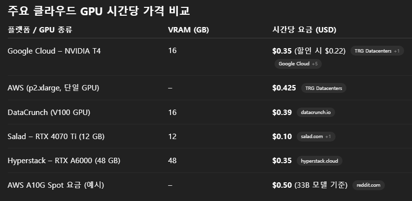 - 안정성과 성능을 중시한다면: Google T4, AWS, DataCrunch 등 – 약 $0.35~$0.45/시간.