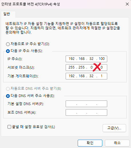 netsh interface ip set address " 로컬 네트워크 " static 192.168.32.100 255.255.255.0 192.168.32.1