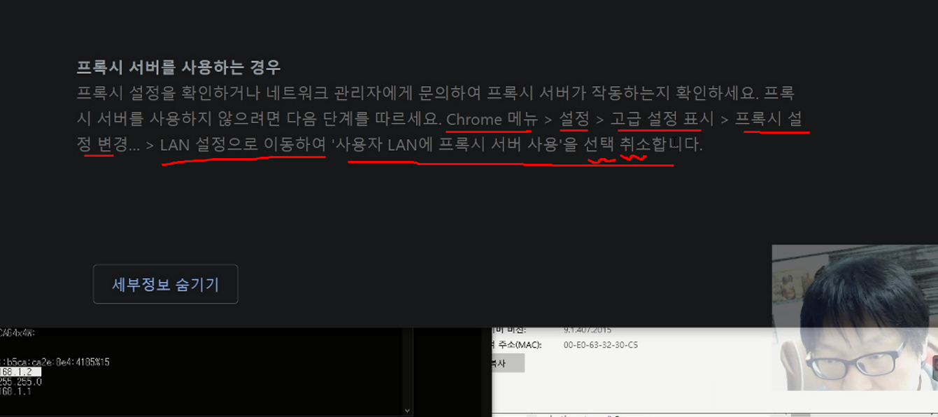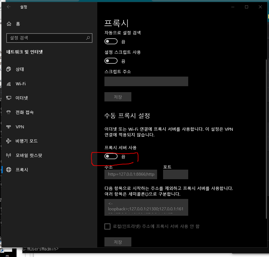 아래 프록시가 설정이 나도모르게 되어있어서 해제 하고나니 해결이 되었다.
