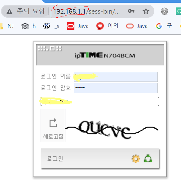192.168.1.1 iptime 공유기로 들어갔다. 기본아이디 admin 암호는 main 이다.