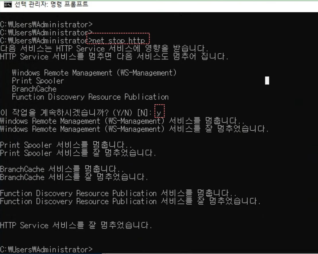 net stop http 라고 하면 4가지 서비스를 중지한다.