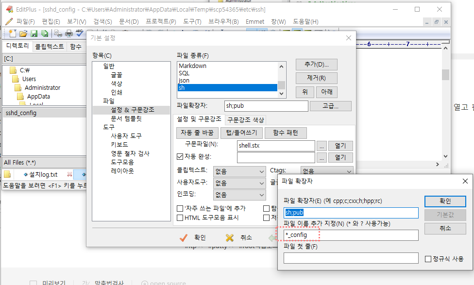 sshd_config 파일을 색상을 예쁘게 나오게 하기위해서 설정한 모습."파일 이름 추가 지정 *_config