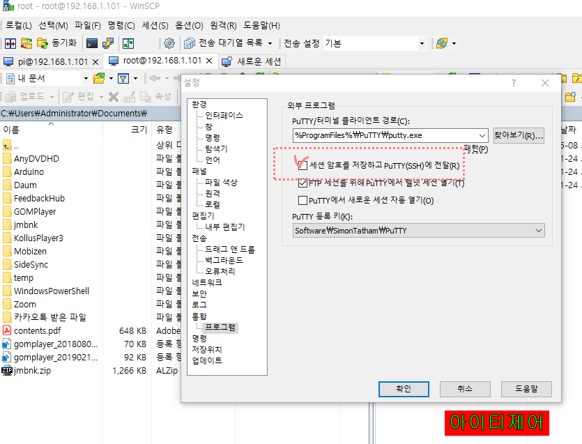 WInSCP와 Puty연동되어 암호를 일일이 기억하거나 다른곳에 저장하지 안하도 되는 편리한이점이 있다.