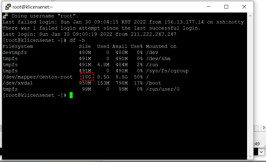 df -h 를 해보면 /dev/mapper/centos-root 와 /dev/xvda1 을 볼수있다..