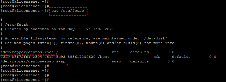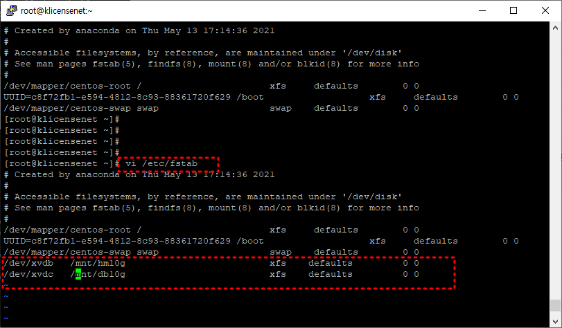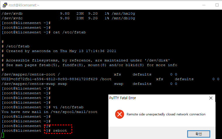 이제 vi /etc/fstab 수정들어간다.