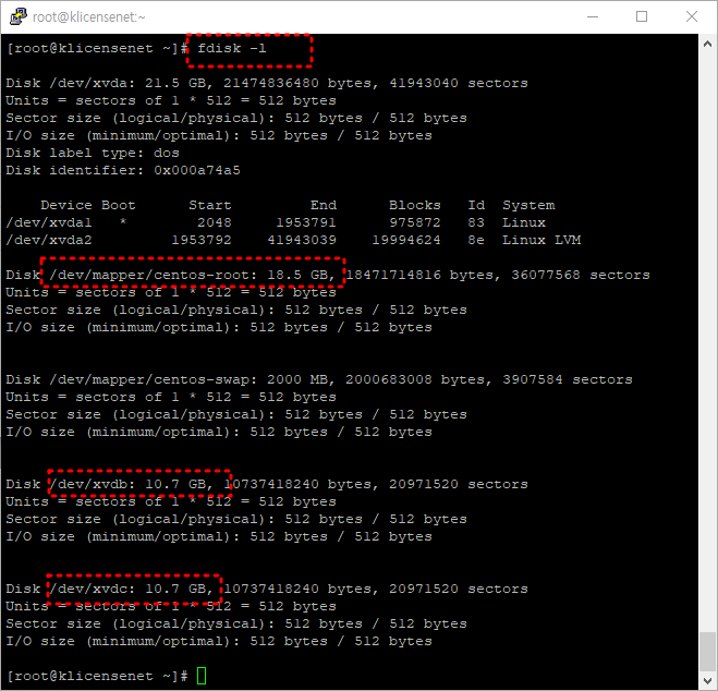 fdisk -l 로 디스크 리스트를 본다.