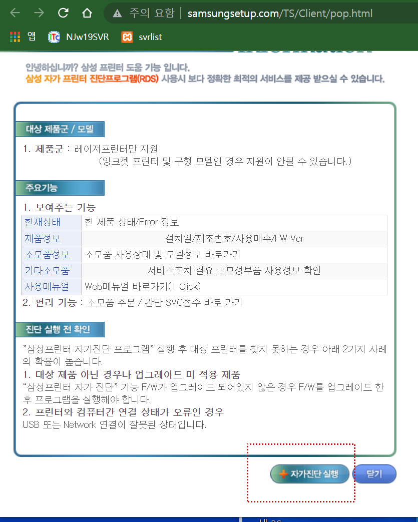 위 드라이버 설치 후 아래 "삼성 프린터 진단 다운로드" 클릭하고 설치