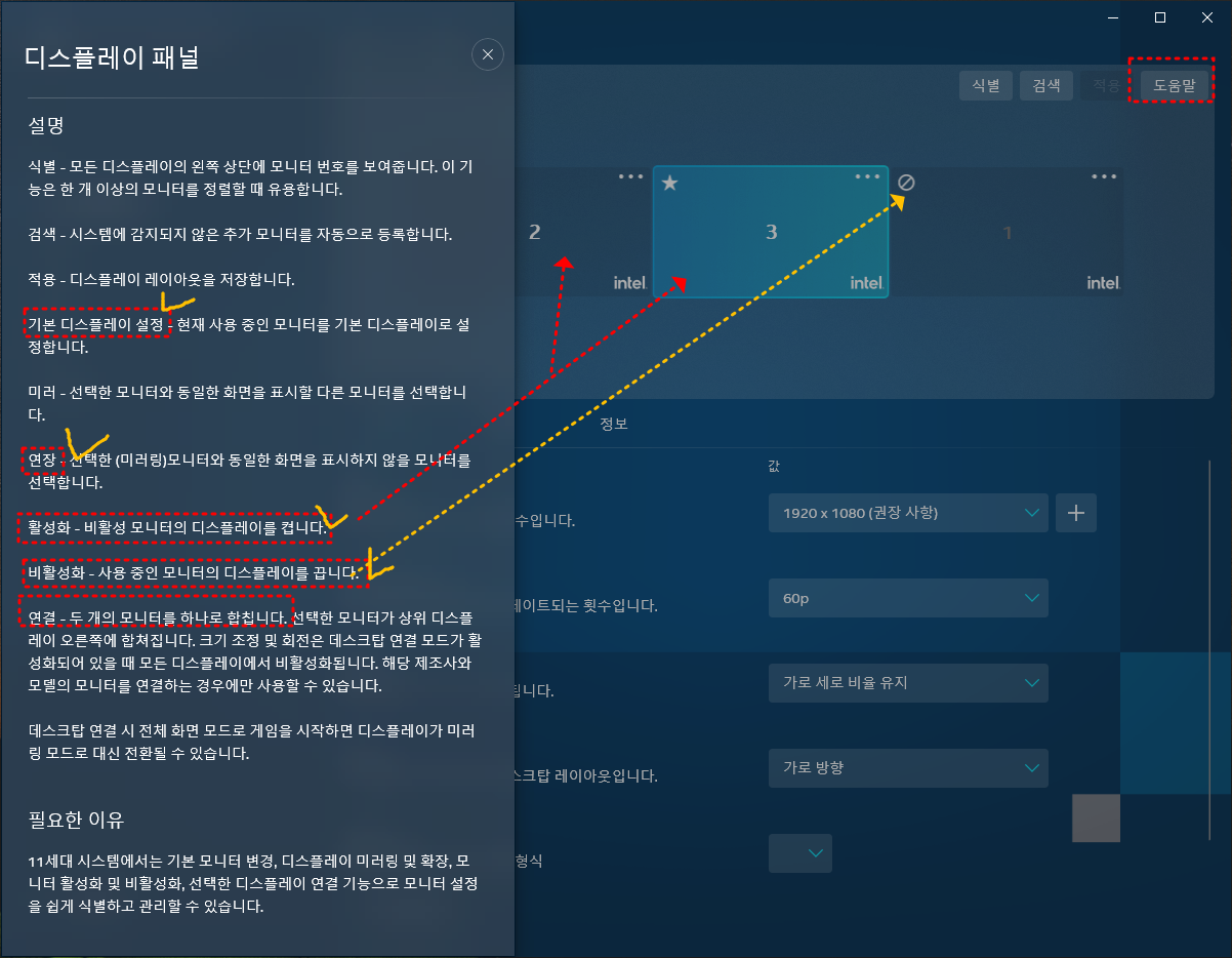 한참을 삽질하다가 인텔 모니터 설정 프로그램이 설정에 없고. 시작메뉴에 있는것을 알게되었고 해결하였다.