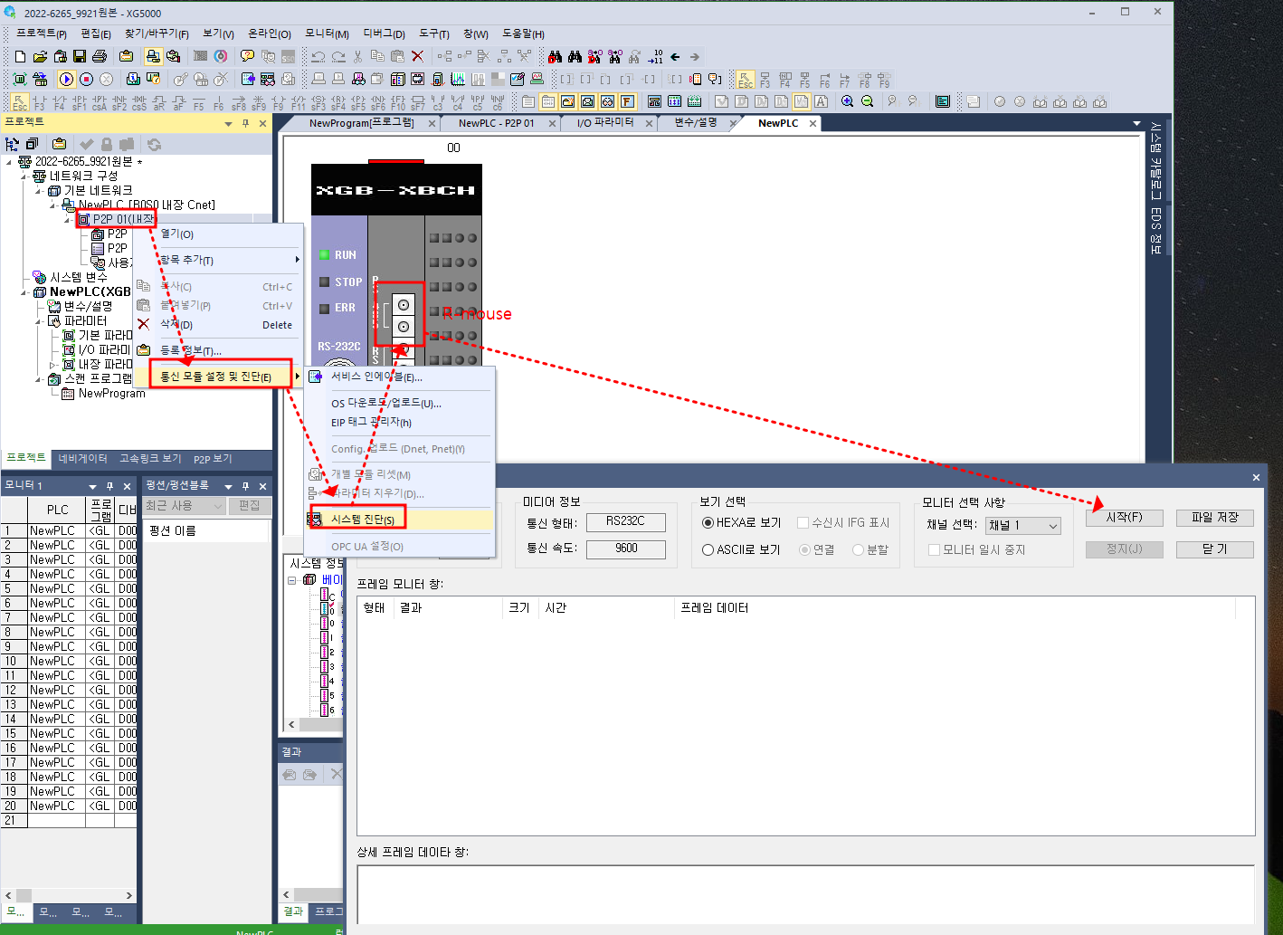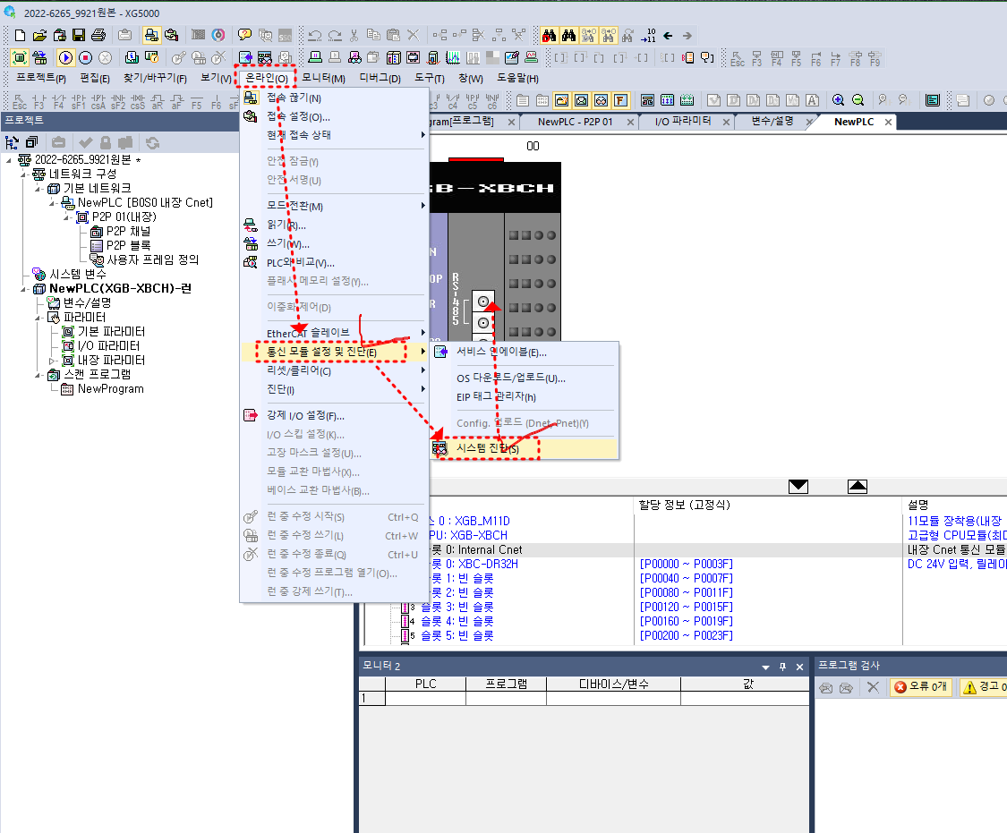 3) 프로젝트 창에서 >> 해당 통신 모듈(ex: P2P 01내장Cnet) 오른마우스 >> "통신 모듈 설정 및 진단(t)" >> ((나머지지는 상동 ))