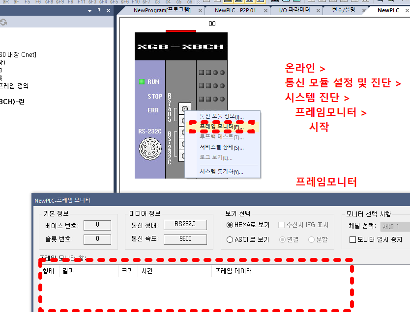 XG5000에서 통신 프레임 모니터링하는 방법이 여러단계인지라 간혹 들아가기 힘들때가 있다..