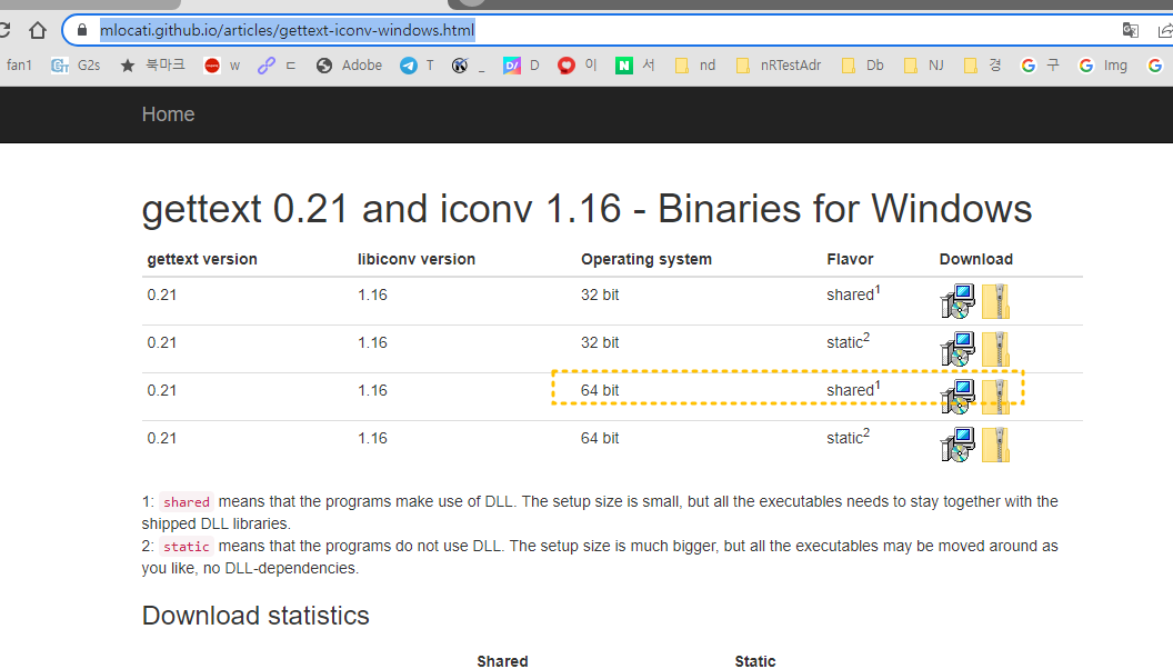 Download gettext & iconv binaries for Windows - 32 and 64 bits - shared and static.