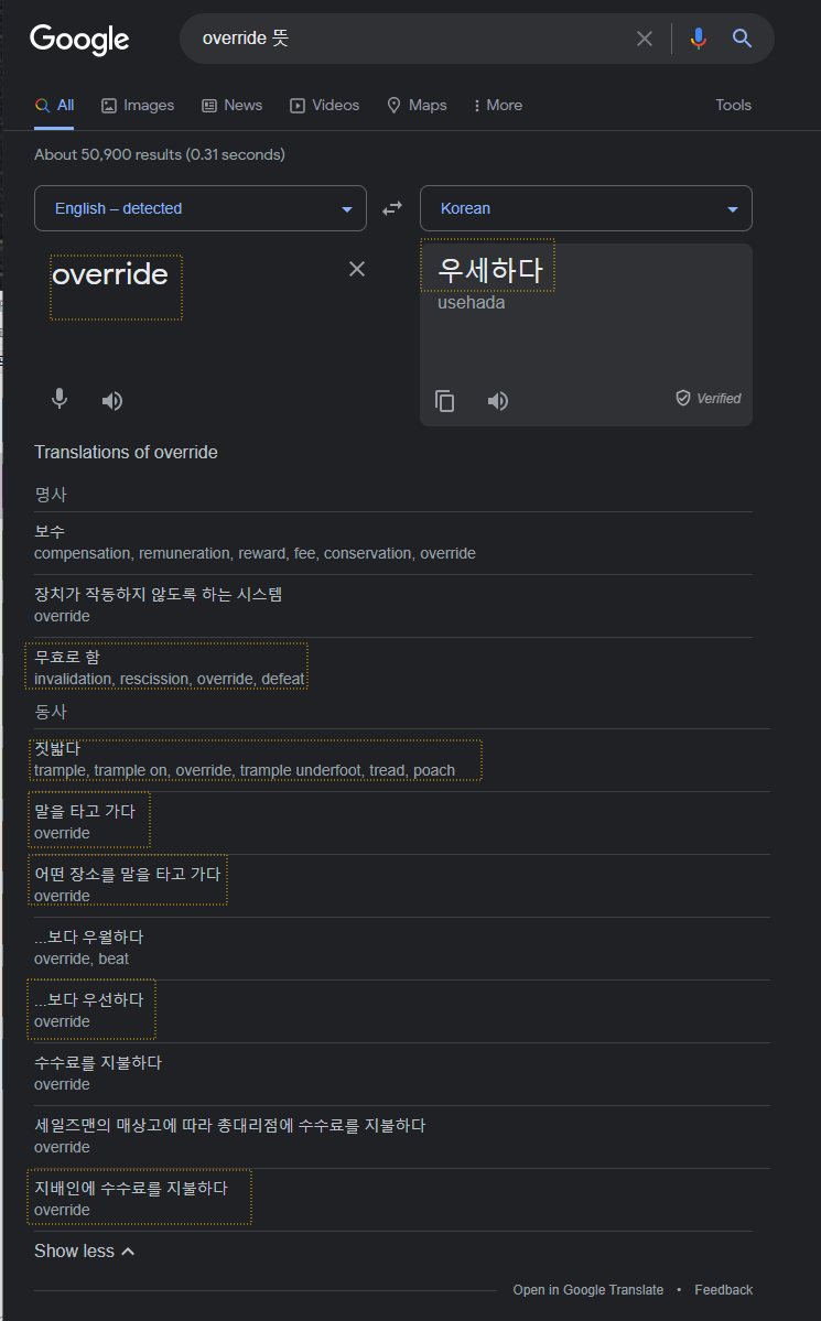 overRide 뜻은 : 말을 타고 가다, 짓밟다, 무효화 하다, 우세하다, 지배하다