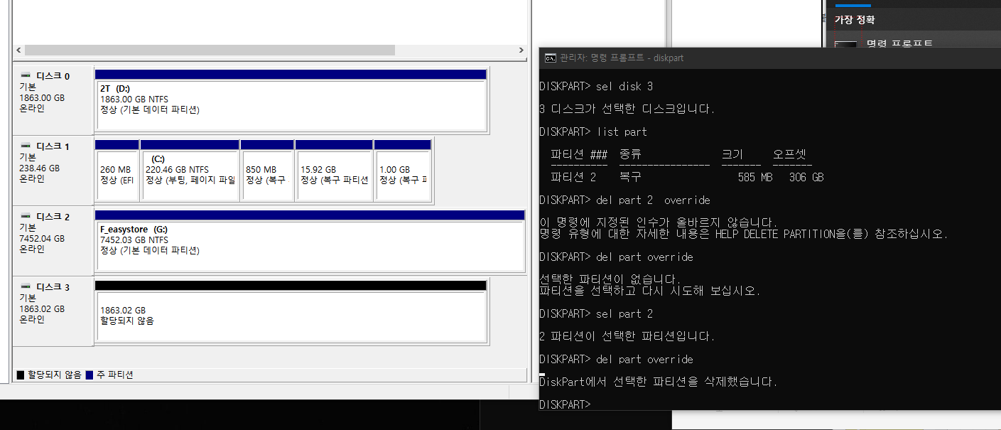 보통 이렇게 하면 일반 파티션을 지워진다.