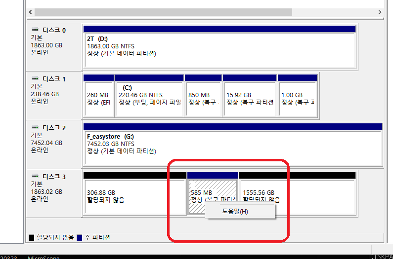 복구 파티션을 지우는 팝업 메뉴가 나오지 않아 이것으로 지울수가 없게되어있다.