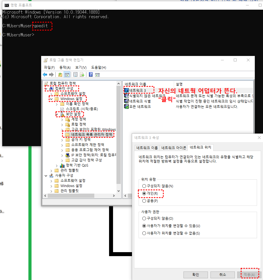 5) "네트워크 위치 " 탭을 선택 ==> "위치 유형 " : "개인" 체크 ==> "적용" ( 재부팅) 끝.
