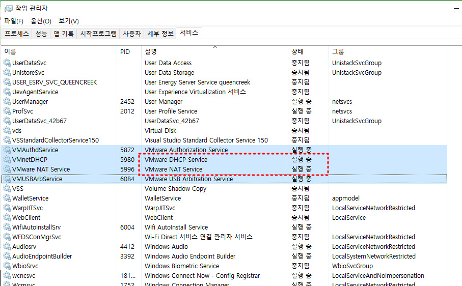 NAT를 이용하려면 VMWare DHCP와 NAT서비스가 실행중 이어야한다.